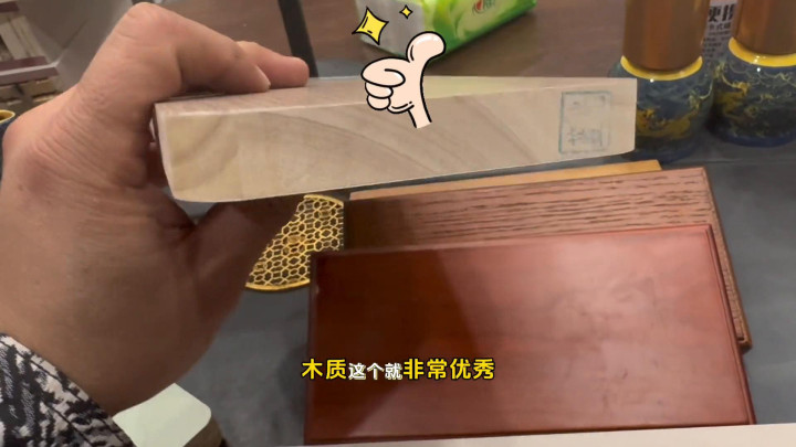 你看就是3A级的实木板,它里面外面这都是实木,你首先木头拿的也沉,这个木种一般市场做实木板的比较多的就是橡胶木,就我手上拿的这种,你看无巴结这种叫3A橡胶木,木质这个就非常优秀。
